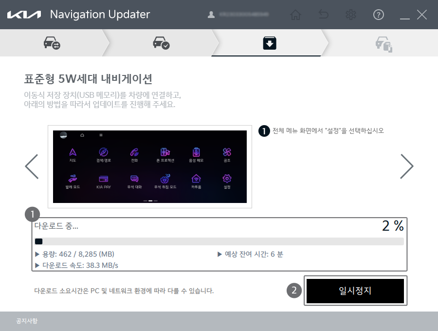 - 내비게이션이 켜진 상태에서만 업데이트 가능: 차량의 전원이나 배터리 충전 상태를 확인하세요. 충전량이 부족하면 업데이트 중에 문제가 발생할 수 있습니다.