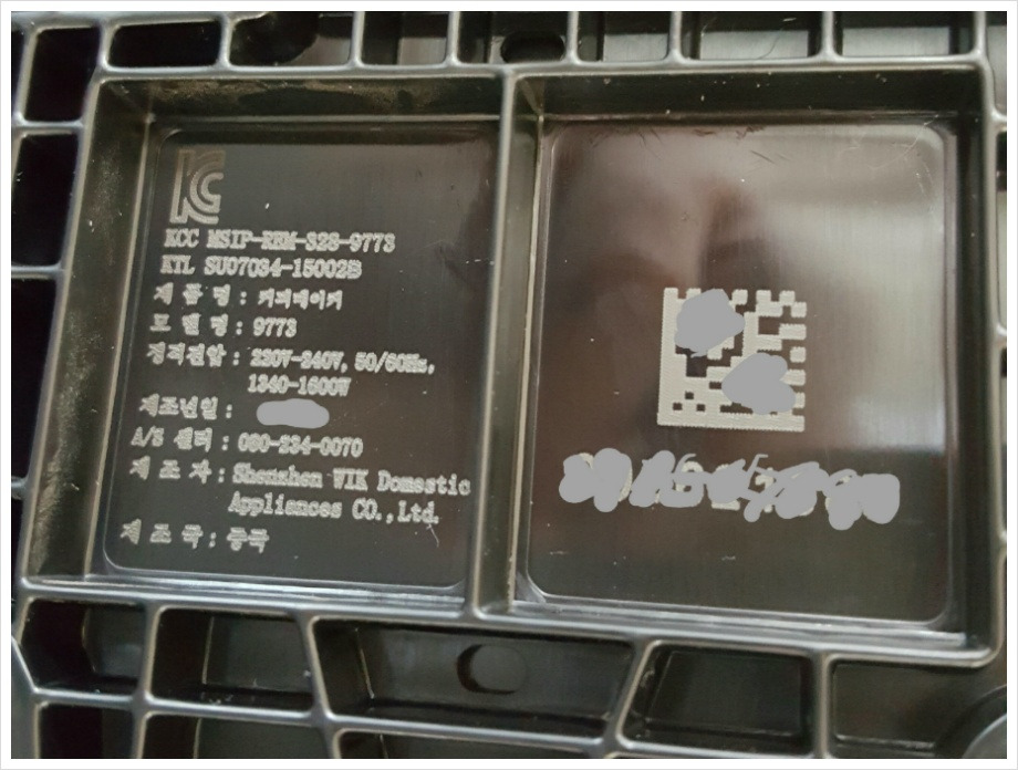 - 머신 하단 QR·KC 라벨: 바닥면 QR 코드 옆에도 동일한 시리얼번호가 인쇄되어 있으며, 네 자리 ‘제조년·주차(예: 4216)’ 표기도 함께 확인할 수 있습니다.