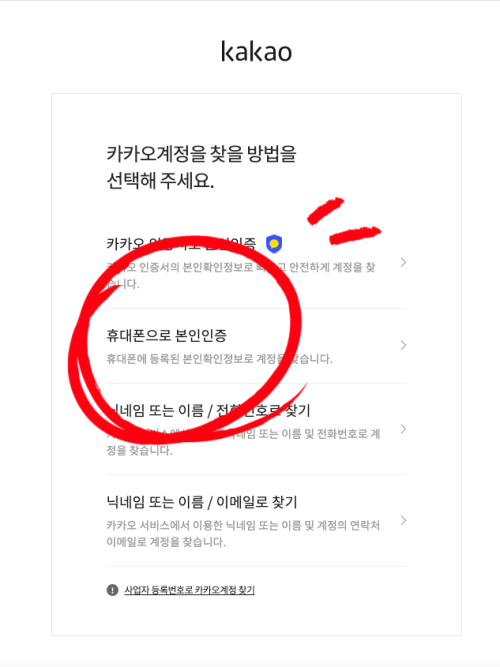 - '카카오 계정 찾기' 버튼을 선택한 후, 휴대폰으로 본인 인증을 진행해 주세요. (휴대폰 인증 외에도 여러 인증 방법이 제공되니 본인이 편한 방법을 선택하시면 됩니다.)