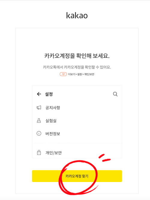 - 카카오톡 계정 로그인 페이지에서 로그인 후 '계정 찾기'를 클릭합니다.