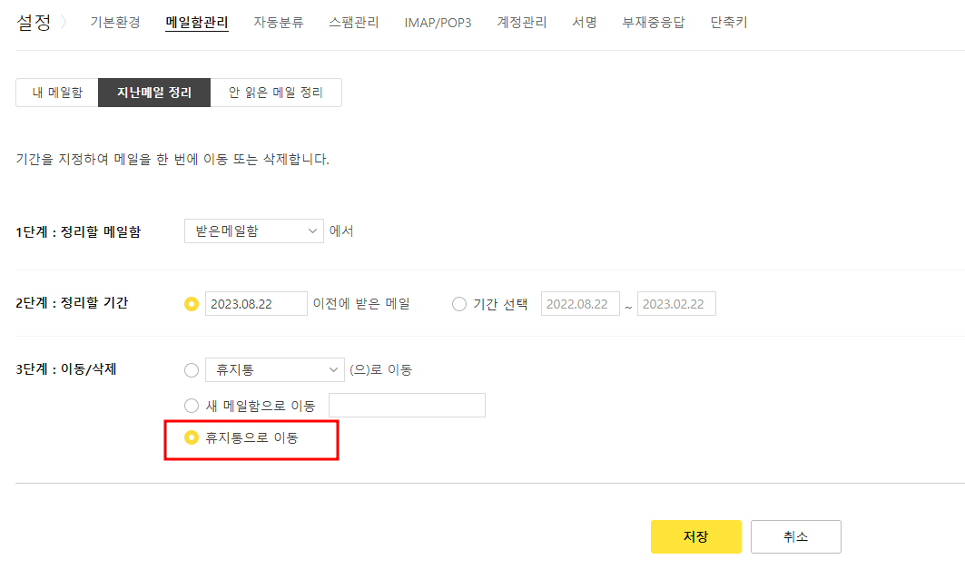 - 정리할 메일함 선택: 삭제하려는 메일함을 선택하세요.