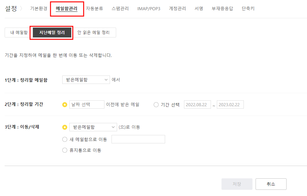 4. 지난 메일 정리 탭 이동: 메일함 관리 탭에서 "지난 메일 정리" 탭으로 이동하세요.