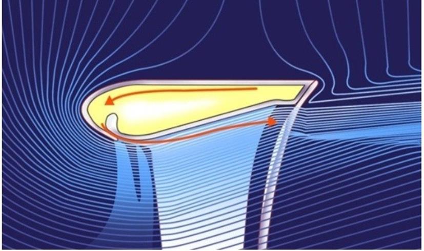 비행기 날개 모양으로 생겨 있는 홀의 틈으로 바람이 흘러나오면 이 바람은 날개의 표면을 타고 흐르고 그 흐름의 경계의 공기도 같이 따라 흐르면서 공기 흐름의 양이 증폭이 되는 원리이다. 다이슨에서 말하는 원리는 위와 같지만, 엄밀히 따지자면, 일반 선풍기의 날개가 3~4개에 불과하기 때문이랄 밖에! 다이슨의 날개 없는 선풍기도 실상은 하단의 원통 내부에 선풍기와 원리상 다를 바 없는 Fan이 돌고 있다.