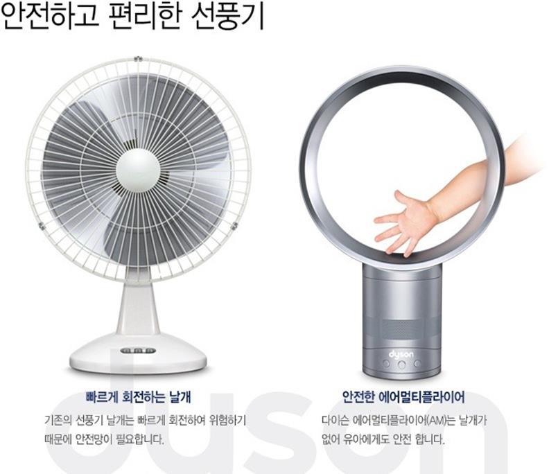 그리고 가장 중요한 날개 없는 선풍기의 장점은 안전성이다. 날개에 부딪힌 공기가 원활하게 빠져나오려면 분명히 구멍이 존재해야 하고 아래 사진에 보다시피 기존 일반 선풍기는 그 공간이라는 것이 아이는 물론 어른의 손가락도 들어가고도 남을 정도였으니 매년 선풍기로 인한 안전사고는 적지 않았다.