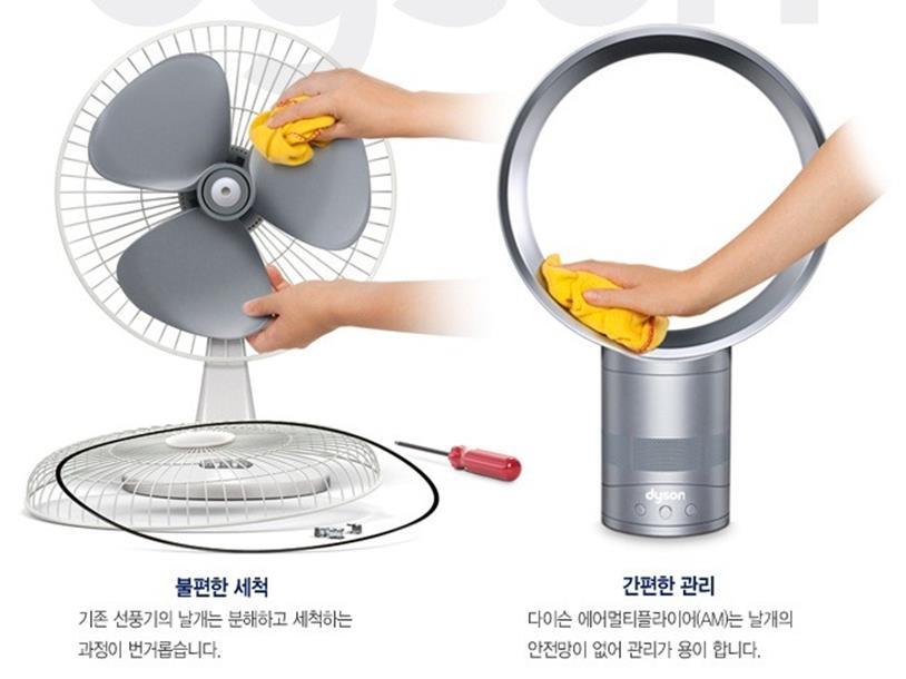 물건을 파는 입장에서는 진실과 거짓을 적당히 섞어서 자사의 상품 판매에 유리한 측면만 이야기하고 싶은 것이 당연할 것이다. 내가 볼 때에는 외관적인 청소는 분명히 날개 없는 선풍기가 더 우수해 보인다. 하지만 앞서도 지적했지만, 다이슨의 날개 없는 선풍기에 진짜 날개(FAN)가 없는 것은 아니다. 오히려 분해하기 힘든 하단 본체 내에 숨어 있는 fan에 붙게 될 먼지들은 어떻게 청소할 것인가? 컴퓨터를 분해해 본 사람들은 알겠지만, 오히려 케이스 속에 감추어진 fan들은 외부에서 보이지 않음에도 불구하고, 일정 시간이 지나면 굉장히 미세한 먼지들이 덕지덕지 눌어붙어서 먼지로 뒤덮인 새까만 fan이 되어 있다.