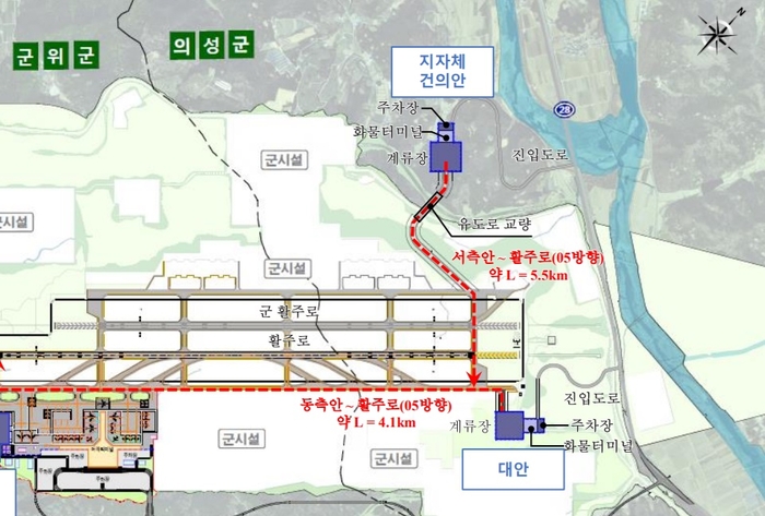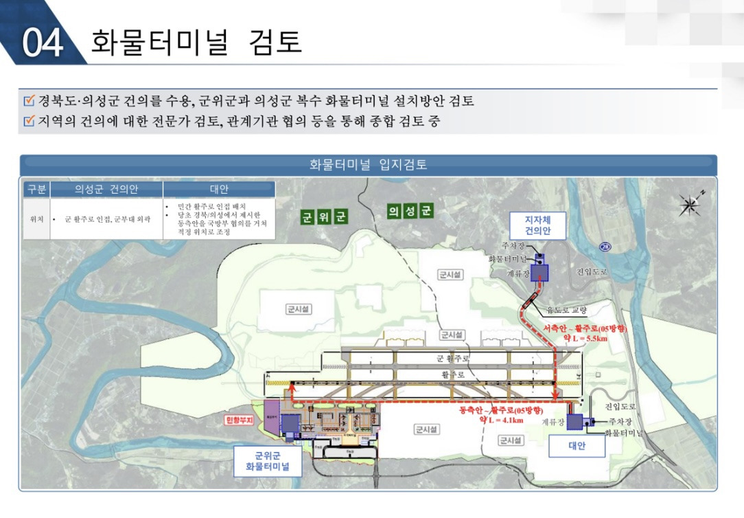 국토부는 최근 입장을 바꾸어 두 개의 화물 터미널 설치를 결정했으나, 의성 화물 터미널의 위치는 경북도와 의성군이 제안한 비안면 일대가 아닌, 남쪽으로 약 5.5km 떨어진 지역으로 검토 중입니다. 국토부는 제안된 위치가 군 작전상 문제가 될 수 있어 대안을 마련했다고 설명하며, 제시된 부지가 사업비 측면에서도 경제성이 높다고 밝혔습니다.