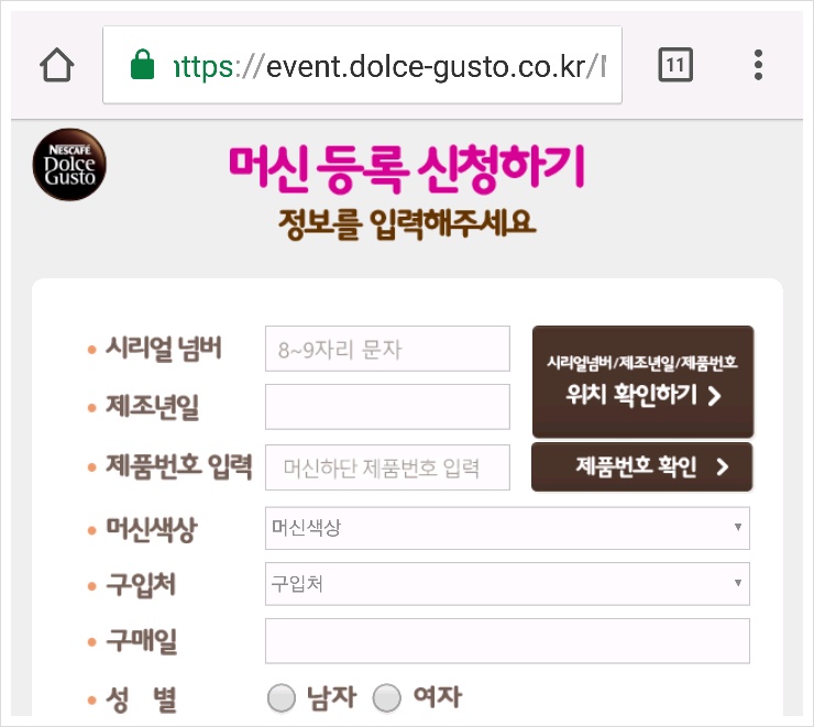 스마트폰에서도 돌체구스토 캡슐 커피머신 정품 등록이 가능하니 미루지 마시고 냉큼 등록하세요.