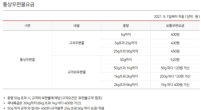 통상우편(보통우편) 요금 안내