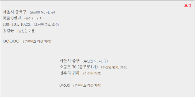 - 우편번호는 받는 사람 주소 위 또는 왼쪽 위 우편번호 박스에 기입