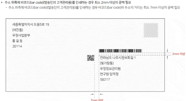 - 봉투 맨 아래 1.7cm 공간은 비워두기 (자동분류장치 인식 구간)