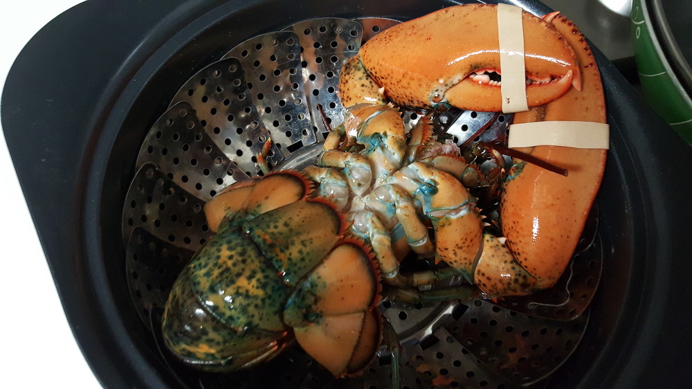 이제 랍스터의 손질이 거의 끝났습니다. 이제 랍스터 찌는법에서 가장 기본 단계인 랍스터를 찜기에 넣어 찌면 됩니다. 만약 저렴한 냉동 랍스터를 구입하셨다면, 위의 과정에서 해감하는 절차는 필요하지 않습니다. 왜냐하면, 죽은 랍스터는 불필요한 물질을 토해내지 않기 때문이죠.