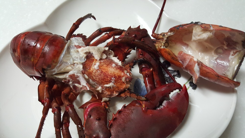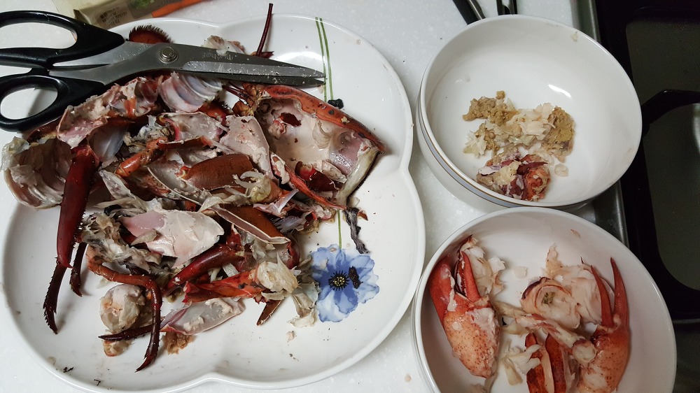 사실, 먹을 수 있는 부분보다 껍데기 쓰레기가 더 많이 나오는 랍스터는, 그 크기에 비해 실질적으로 먹을 수 있는 부분이 그렇게 많지 않습니다. 랍스터가 먹었던 새우 껍질이나 갯지렁이 같은 미끼들이 위 속에 가득 차있을 수 있습니다. 다행히, 랍스터를 찌는 동안 이러한 미끼들이 같이 쪄져서 맛의 복합성에 기여했을 것입니다.