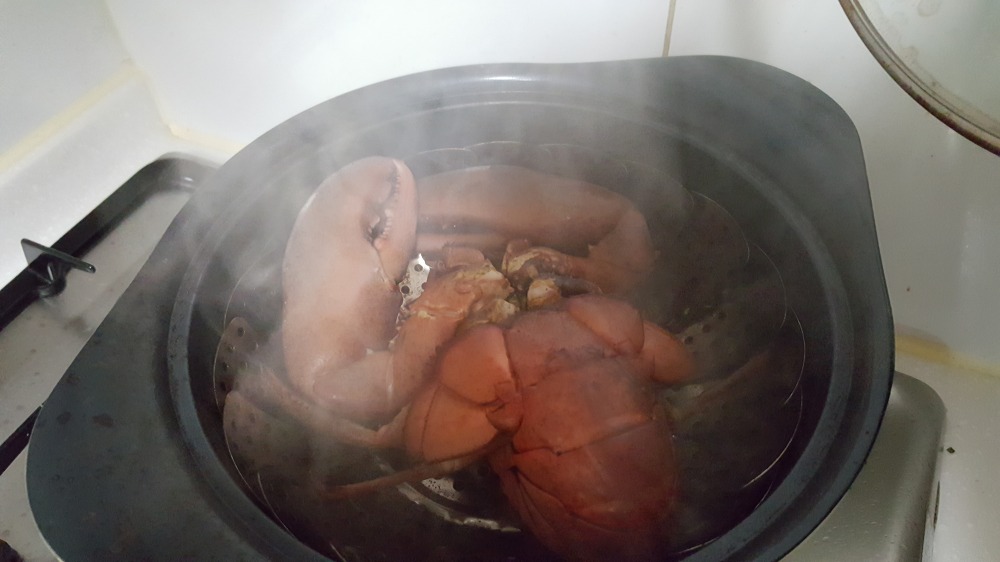 랍스터를 찌는법도 역시 간단합니다. 먼저 찜기나 냄비에 찜용 삼발이를 올려놓고, 거기에 기절한 상태의 랍스터를 올려놓으면 됩니다. 이때 킹크랩을 찌는 방법과 마찬가지로, 랍스터를 뒤집어서 배가 위로 오도록 놓는 것이 중요한 포인트입니다.