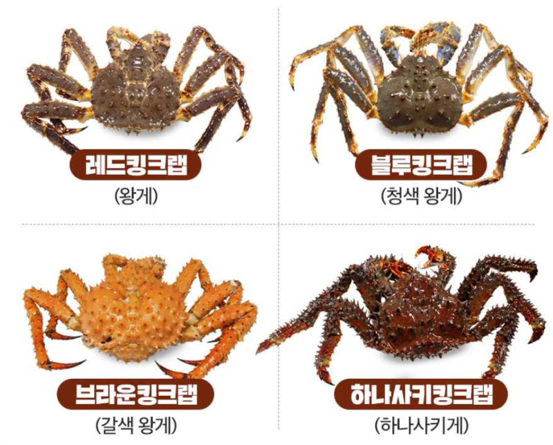 킹크랩은 크게 레드킹크랩, 블루킹크랩, 그리고 브라운킹크랩, 하나사키킹크랩으로 나뉘지만, 실제로 소비자들이 많이 만나는 종류는 레드킹크랩 블루킹크랩입니다. 브라운킹크랩은 상대적으로 저렴한 가격과 거친 맛 때문에 인기가 덜하지만, 다양한 요리에 활용할 수 있다는 점에서 나름의 매력을 지니고 있습니다. 하나사키는 모르셔도 됩니다. ㅎ