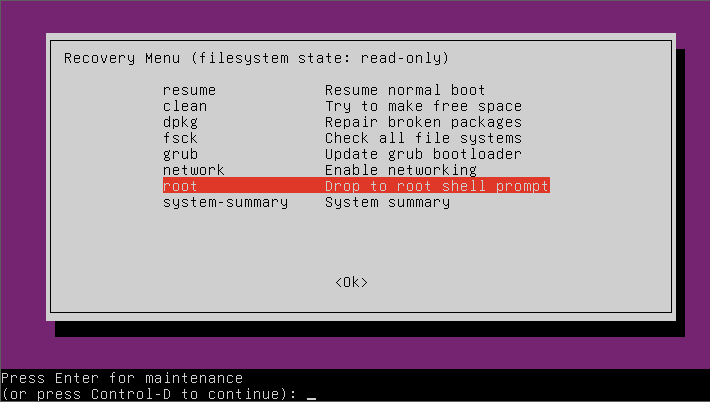 - recovery 모드가 붙은 커널을 선택하면 여러 복구 메뉴가 나타납니다.