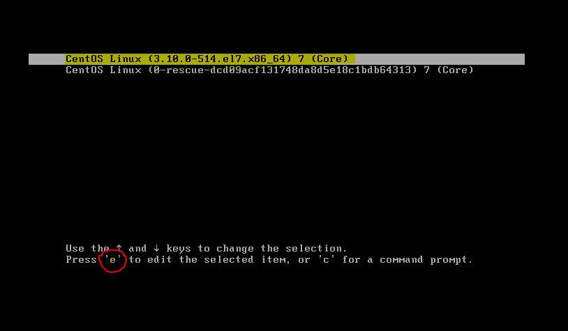 Press any key to enter the menu메시지가 나타날 때 즉시 방향키를 눌러 GRUB 메뉴로 진입합니다. - 기본 커널 행을 선택한 뒤