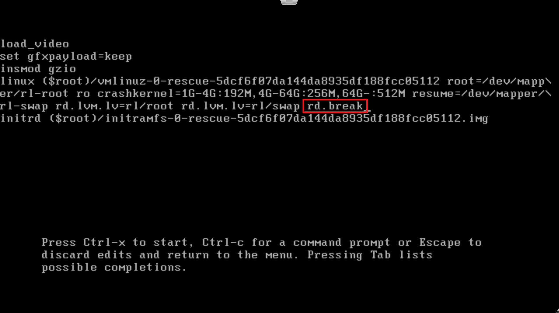 이제 rd.break를 추가한 후 'ctrl-x'를 눌러 부팅을 시작합니다.