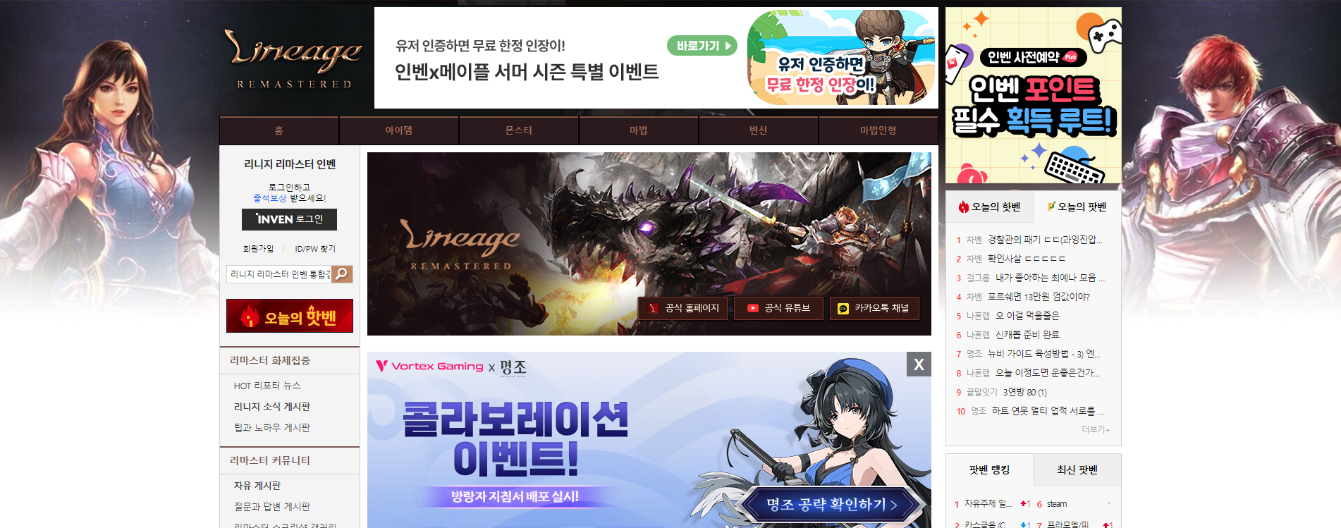 리니지M리니지 M 인벤은 리니지 M의 공략법, 최신 뉴스, 유저 간의 커뮤니티를 제공하는 사이트입니다. 리니지 M 초보부터 고수까지 다양한 유저들이 활동하며, 게임에 대한 유용한 정보를 공유합니다. 이곳은 리지니 M만을 위한 곳이기 때문에, 리지니 M이 아닌 PC리니지 등을 즐기시려면 리니지 인벤 을 이용하시면 됩니다.