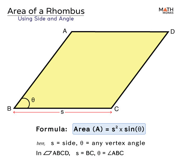 마름모의 한 변의 길이와 임의의 각이 주어질 때 넓이를 구하는 공식도 있습니다. 이 경우 다음과 같은 공식을 사용합니다: