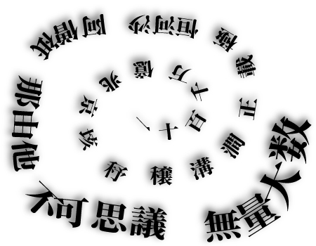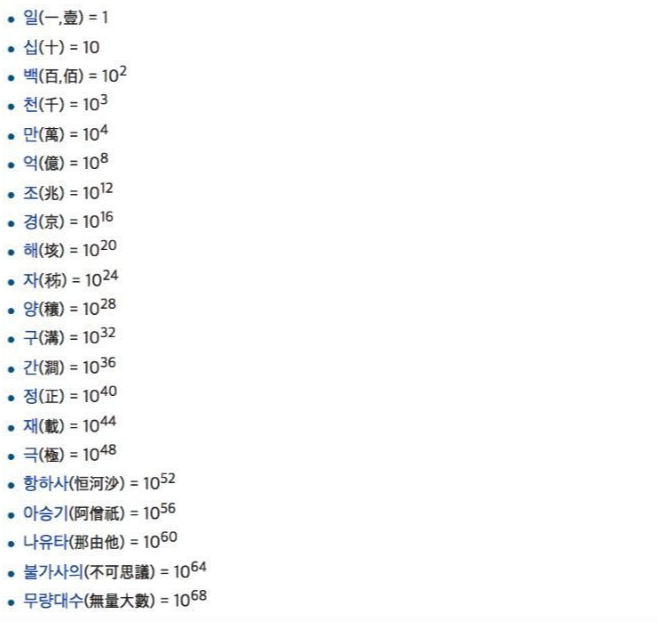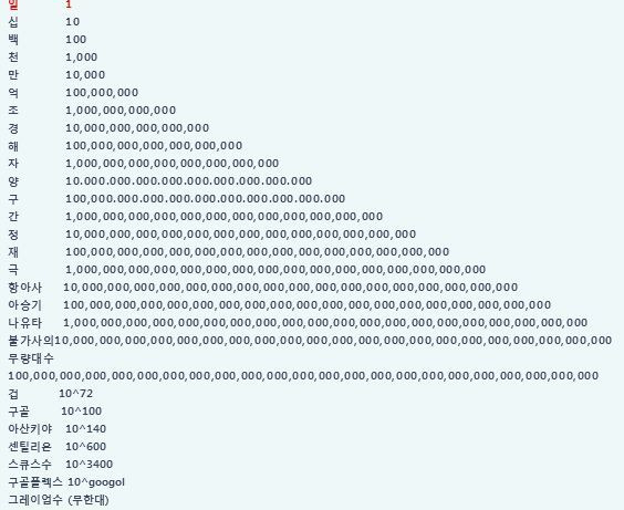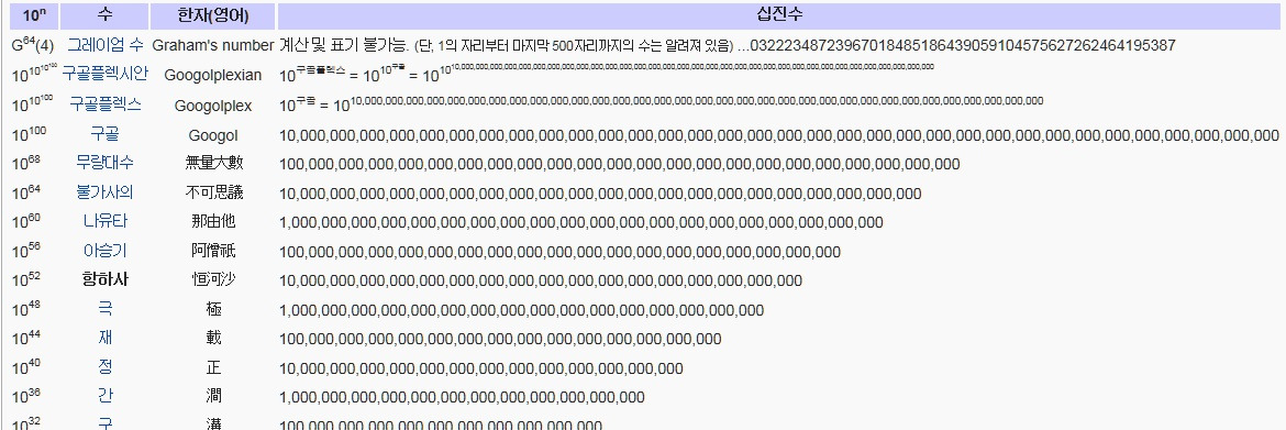 만억조경해자양구간정재극 큰 수의 이름 : 항하사, 아승기, 불가사의, 무량대수, 구골, 겁
