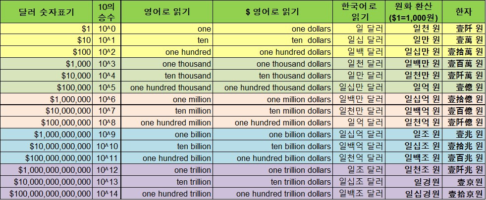 한국어 명수법은 원칙적으로 만진법(以萬遞進)을 사용합니다. 즉, 단위가 네 자리(10⁴)마다 바뀌며, 각 단계별 접두어는 고대 중국 한자 수사(數詞)에서 유래했습니다.