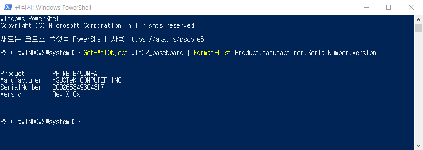 Enter키를 누릅니다.Get-WmiObject win32_baseboard | Format-List Product,Manufacturer,Version,SerialNumber - 메인보드 정보 확인: 명령어가 실행되면 메인보드의 제품(모델명), 제조업체, 버전, 일련번호 등이 표시됩니다.