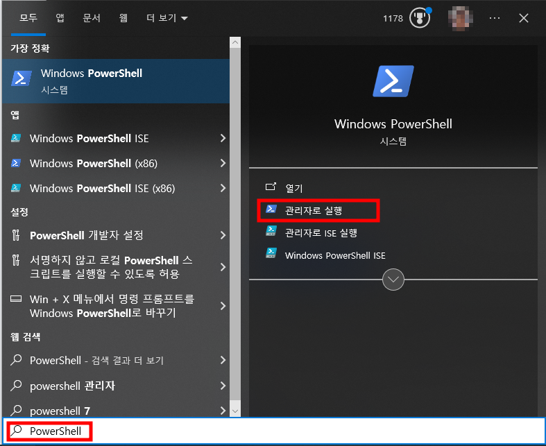 Windows키를 누르고PowerShell을 입력한 후Enter키를 눌러 파워셸을 엽니다. - Get-WmiObject 명령어 입력: 파워셸 창에서 다음 명령어를 입력하고