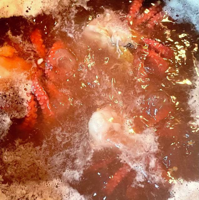냄비에 물을 가득 붓고 한소끔 팔팔 끓으면, 문어 다리를 먼저 천천히 넣어줍니다. 다리를 넣었다가 빼기를 2~3회 반복하면, 문어의 근육이 순간 수축했다 이완되면서 훨씬 부드러운 조직을 갖게 됩니다. - 몸통까지 완전히 담그기