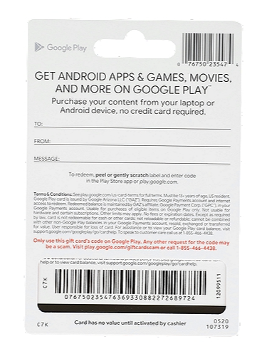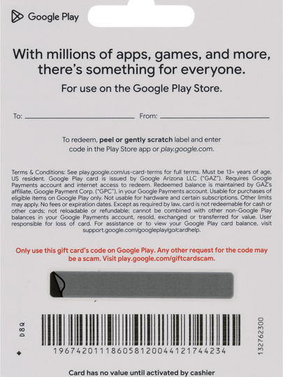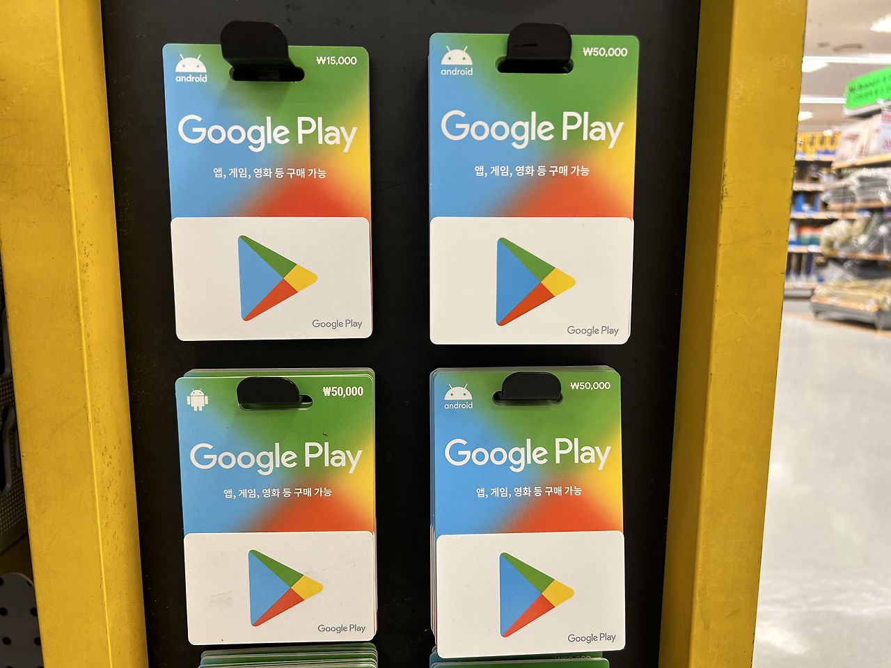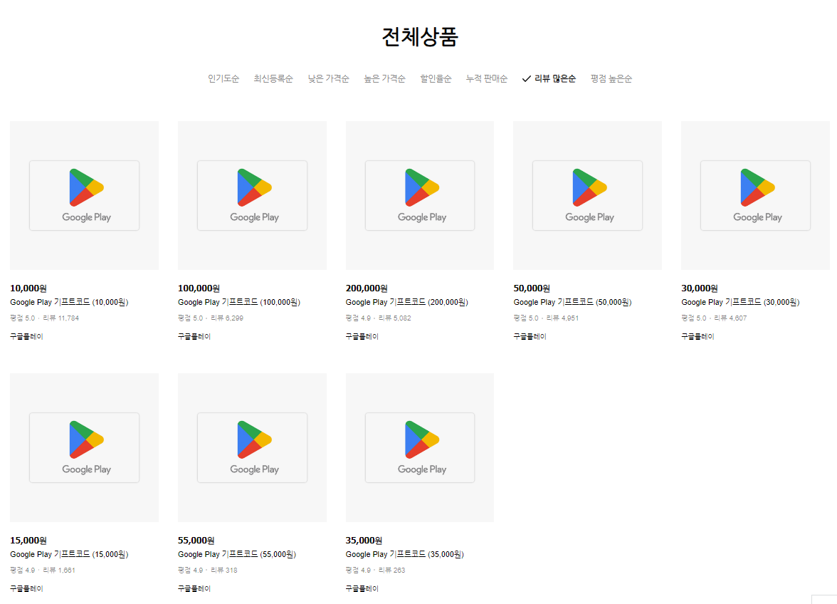 구글 기프트카드(Google Play Gift Card)는 구글플레이 스토어에서 현금처럼 사용할 수 있는 선불 카드입니다. 금액은 5천원, 1만원, 3만원, 5만원, 10만원 단위 등으로 다양하게 판매되며, 편의점, 마트, 온라인 쇼핑몰에서 구매할 수 있습니다.