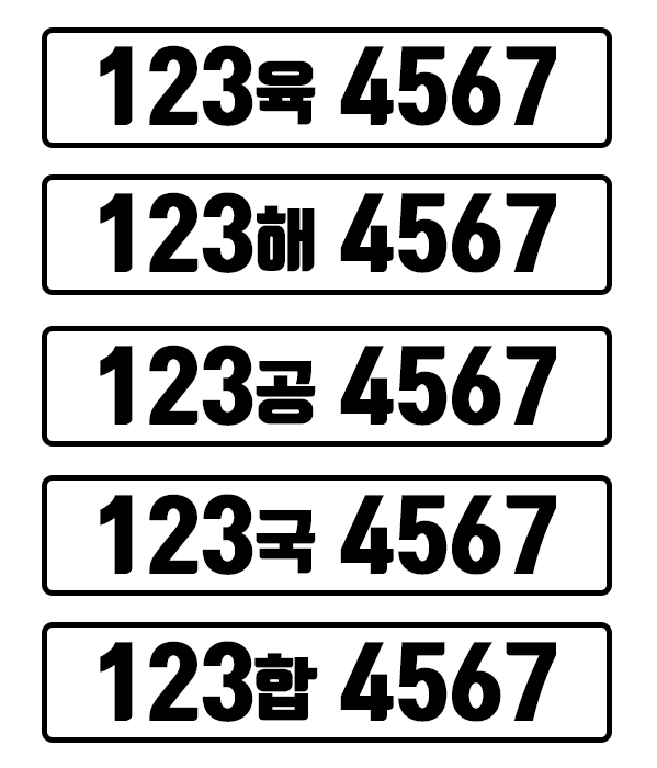 군용 차량의 경우, 앞의 숫자는 부대 번호를 나타내며, 중간에 들어가는 한글은 군종을 구분합니다: