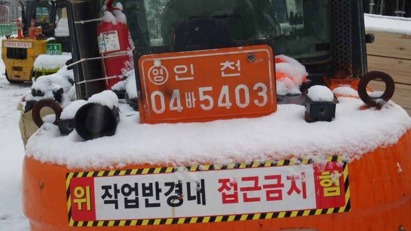 주황색 바탕에 흰색 글씨로 된 번호판은 영업용 건설기계나 중장비 차량에 사용됩니다. 세금을 상당히 면제해 주는 대신 전쟁이나 비상시에 국가가 이들 차량을 징발할 수 있습니다. 자가용 건설기계의 경우는 초록색 바탕에 흰색 글씨로 구분됩니다. 번호판에는 [지역00가0000] 형식으로 등록지의 지역을 표시하고 있으며, 징발 가능한 영업용 차량임을 나타내기 위해 '영'이라는 글자를 동그라미 안에 넣어 표기하고 있습니다.