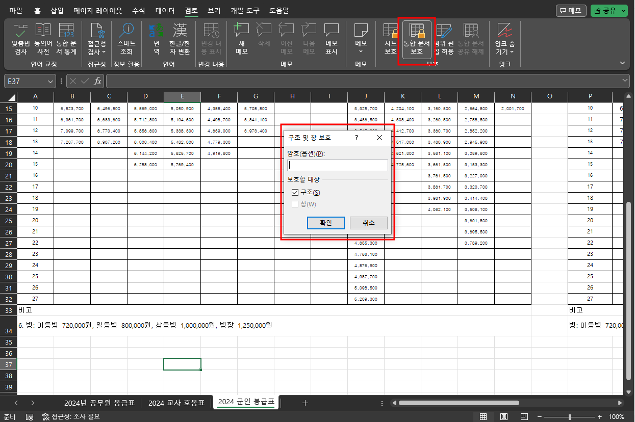 Excel 통합 문서의 구조를 암호로 보호하는 방법은 아래와 같습니다.