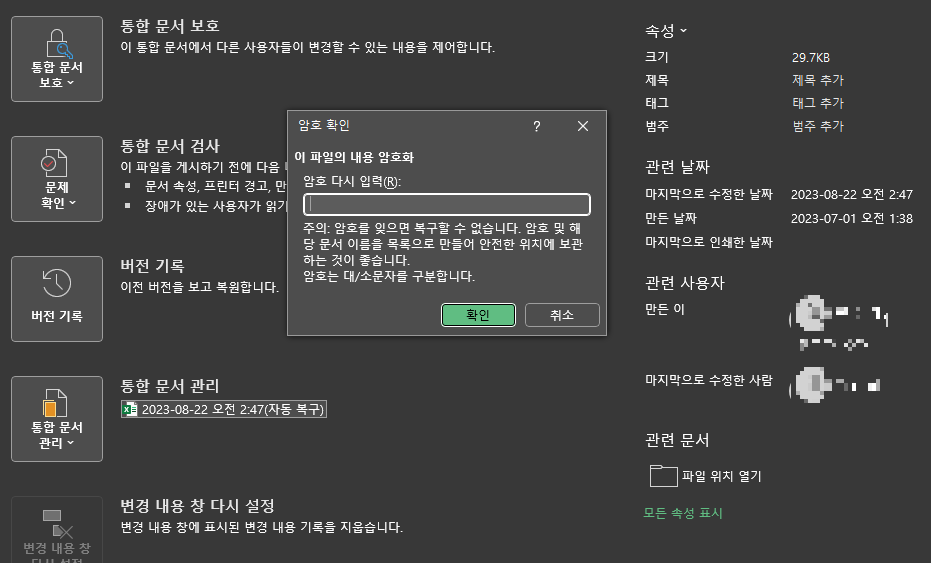 엑셀 통합 문서를 열거나 수정할 때 암호 요구