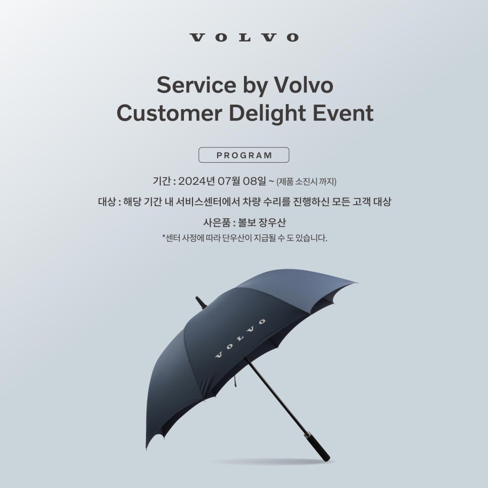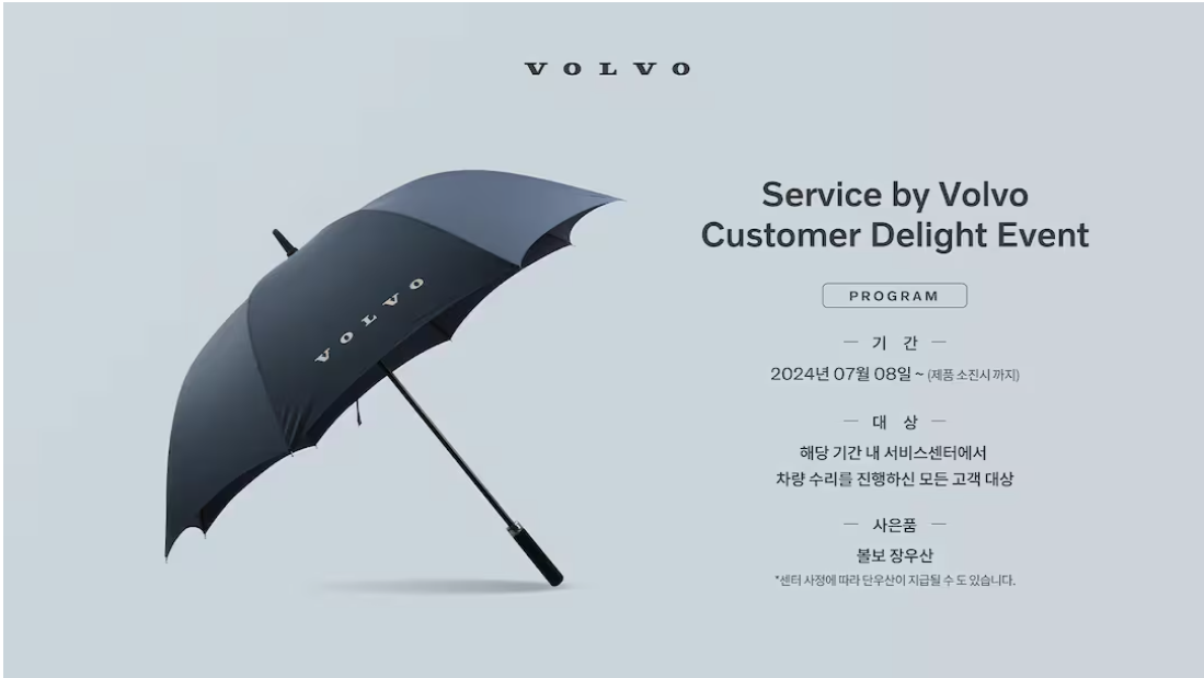 이번 캠페인은 볼보자동차 고객들이 여름철 장마와 폭염 속에서도 안전하게 차량을 운행할 수 있도록 돕는 것을 목적으로 합니다. 사전에 차량을 점검하고 필요한 정비를 받음으로써 차량 고장을 예방하고, 예기치 않은 상황에서도 차량이 최상의 상태를 유지할 수 있습니다. 또한, 고객들에게 제공되는 장우산은 실용성과 함께 브랜드에 대한 긍정적인 이미지를 강화하는 역할을 할 것입니다.