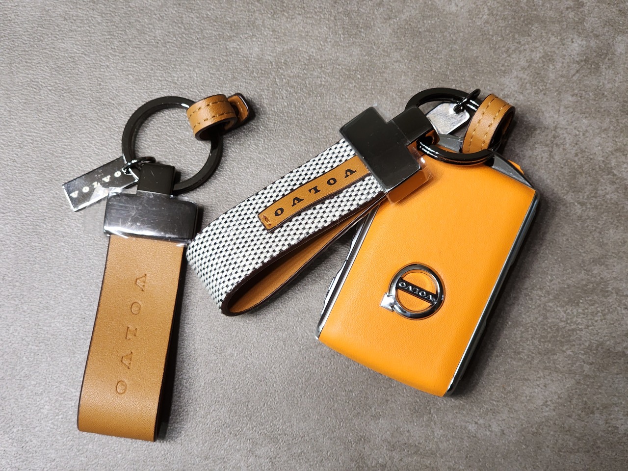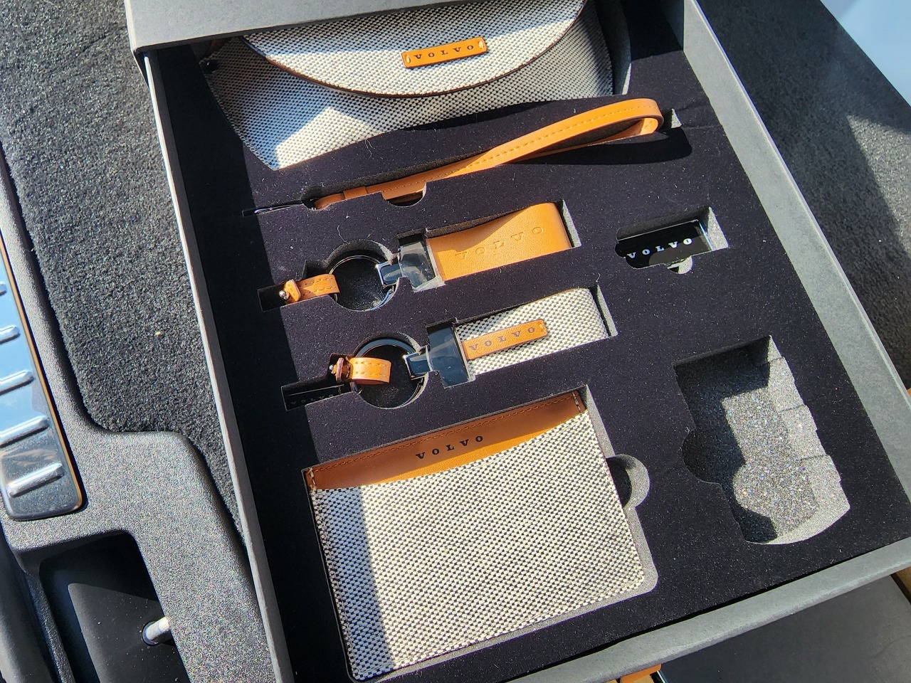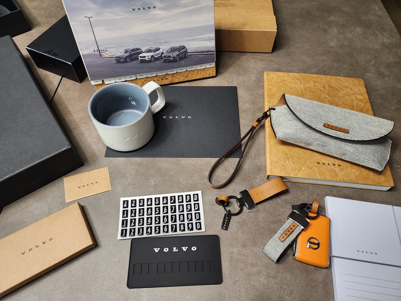 볼보 로고 머그, 볼보 카드지갑(명함지갑?), 볼보 레더 키링, 볼보 연락처판...