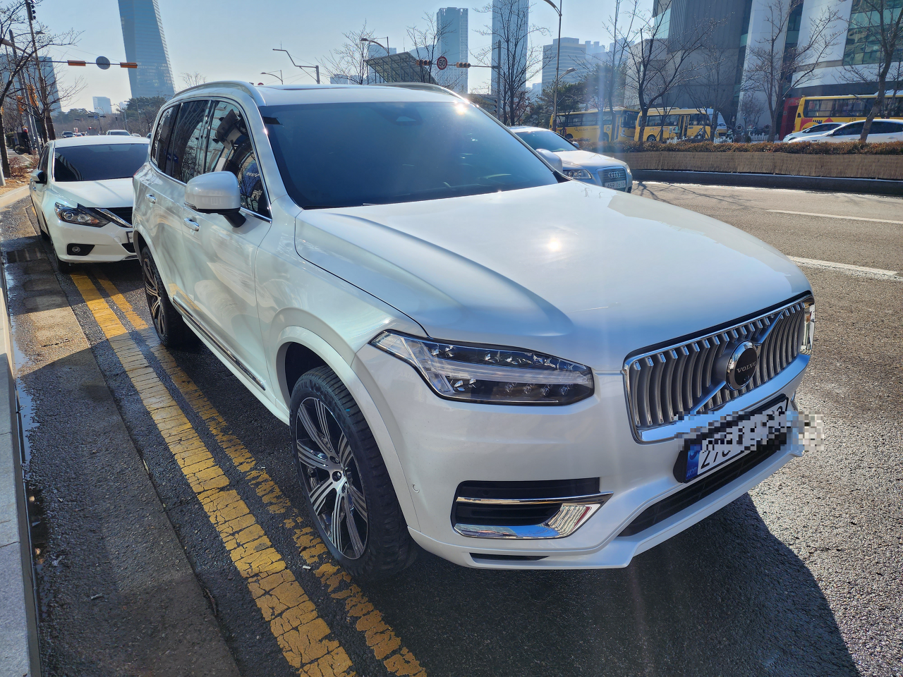 트림은 볼보 XC90 T8 얼티메이트 브라이트 플러그인 하이브리드 XC90 T8 Ultimate Bright PHEV입니다. 색상은 크리스털 화이트펄 색이고요. XC90 트림 중 가장 최상위 트림 풀옵션 팍팍. 가격은 1억 2천 근처 언저리쯤 되나 봅니다. 뭐 할인받고 뭐 추가되고... 는 기억 안나고요.