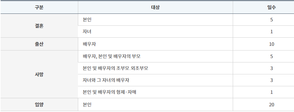 - 본인 및 배우자의 부모 사망: 5일 (장인, 장모 포함)