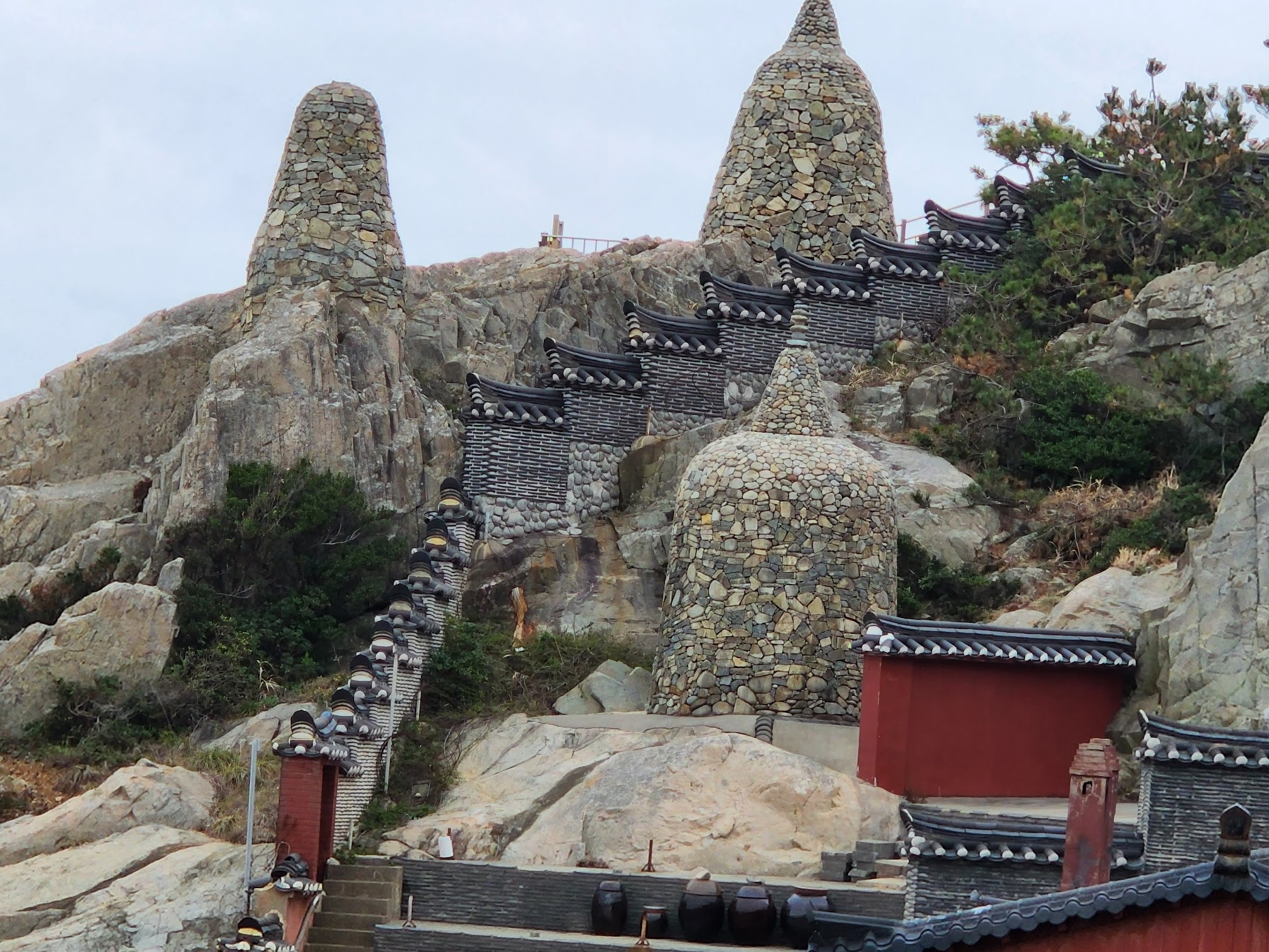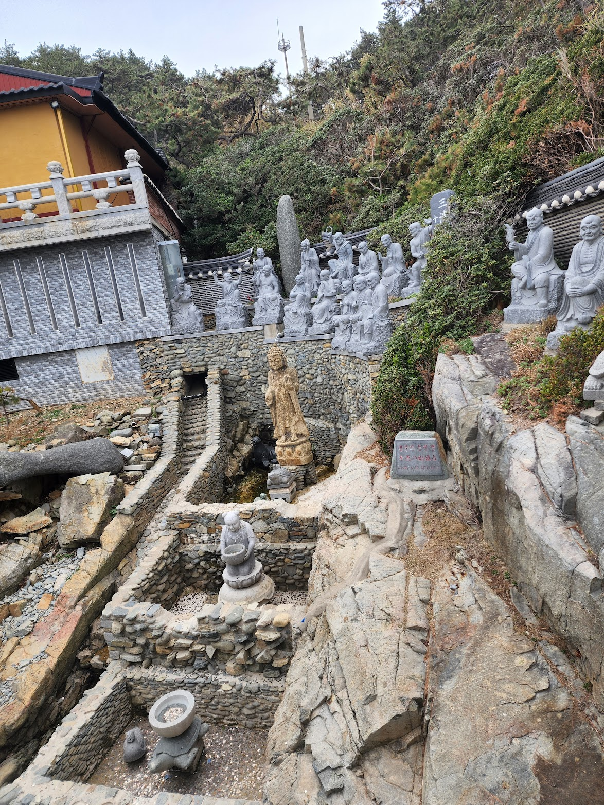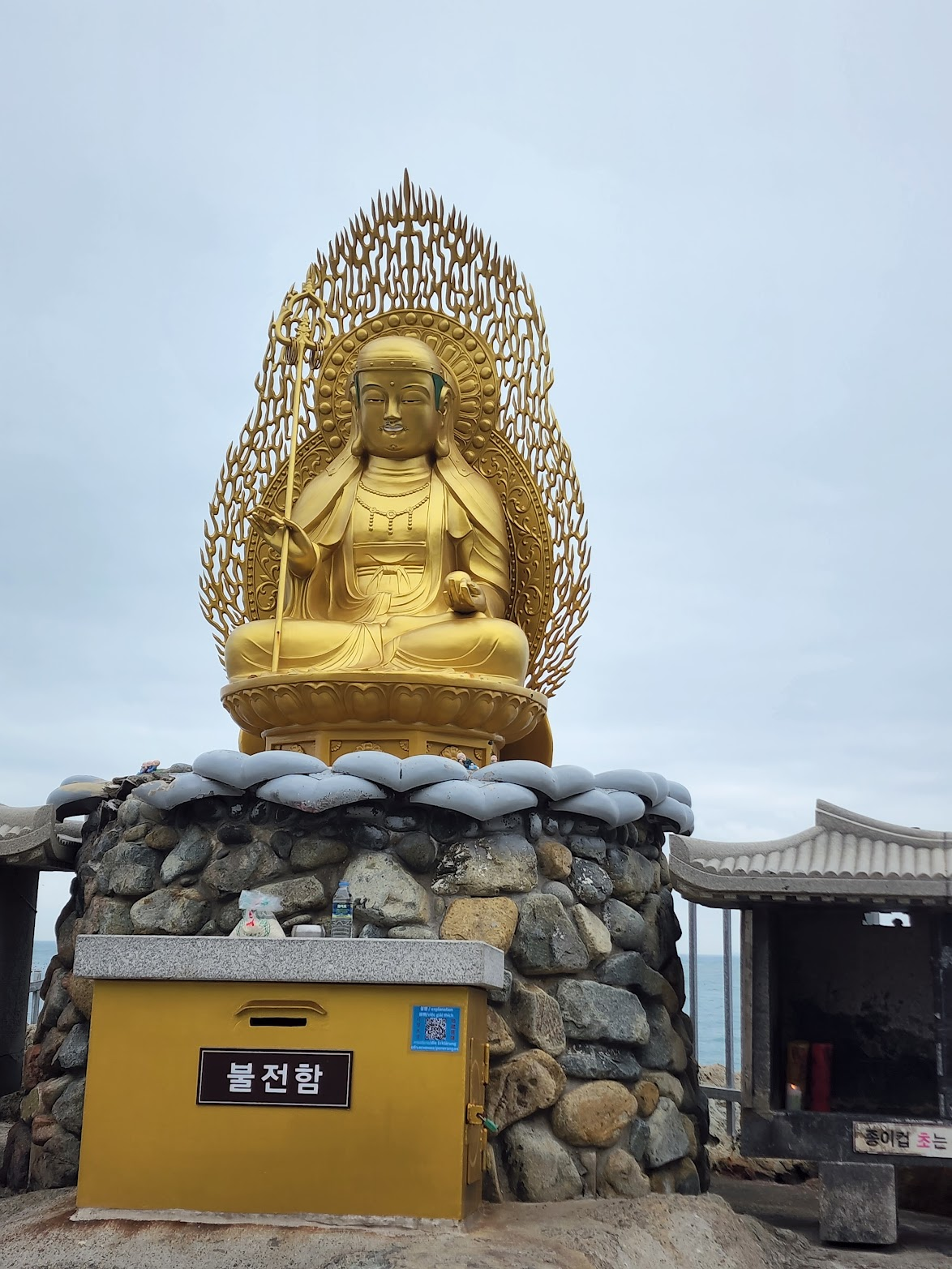 대웅전은 해동용궁사의 중심이자, 가장 중요한 의식이 이루어지는 공간입니다. 정암 스님이 중창한 이 건물은 단순히 예배의 장소를 넘어서, 관세음보살을 모시는 성스러운 공간입니다. 대웅전 앞에는 사사자 3층 석탑이 자리하고 있으며, 이 석탑은 원래 미륵바위라 불리던 3미터 높이의 바위가 있던 자리였습니다. 이 바위는 임진왜란과 6·25 전쟁 동안 파괴되었으나, 1990년 정암 스님이 복원 작업을 시작하면서 다시 세워졌습니다. 그 안에는 불사리 7과가 봉안되어 있어, 신도들은 이곳에서 기도를 드리며 평화와 안녕을 기원합니다.