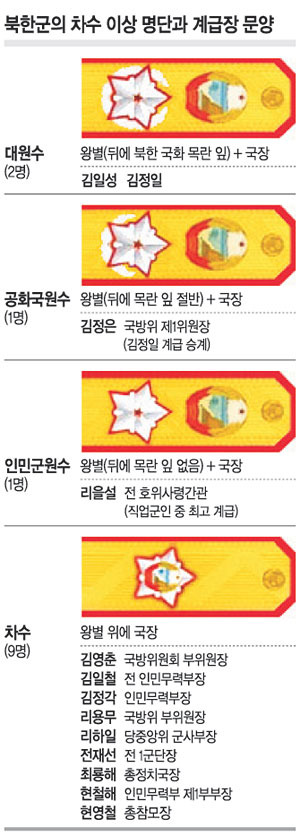 원수급은 북한 특유의 계급으로, 대원수, 원수, 차수 등의 칭호가 있으며, 이는 북한 최고위층의 권위를 상징한다. 1950년대 초부터 김일성, 김정일, 김정은 등 지도자와 그 측근들에게 수여된 사례가 있으며, 정치적 충성심을 반영하는 상징적 요소로 자리 잡았다.