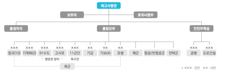 - 명령 체계: 노동당 중앙군사위원회(김정은) → 총정치국장 → 각 군단 정치위원 → 정치지도원 → 일반 병사.
