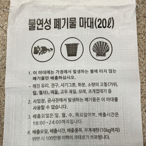불연성 쓰레기와 가연성 쓰레기는 반드시 별도의 봉투에 담아 배출해야 합니다. 혼합 배출 시 수거 과정에서 문제가 발생할 뿐 아니라, 벌금 등 행정 처분을 받을 수 있습니다. - 지정 배출 시간과 장소 준수