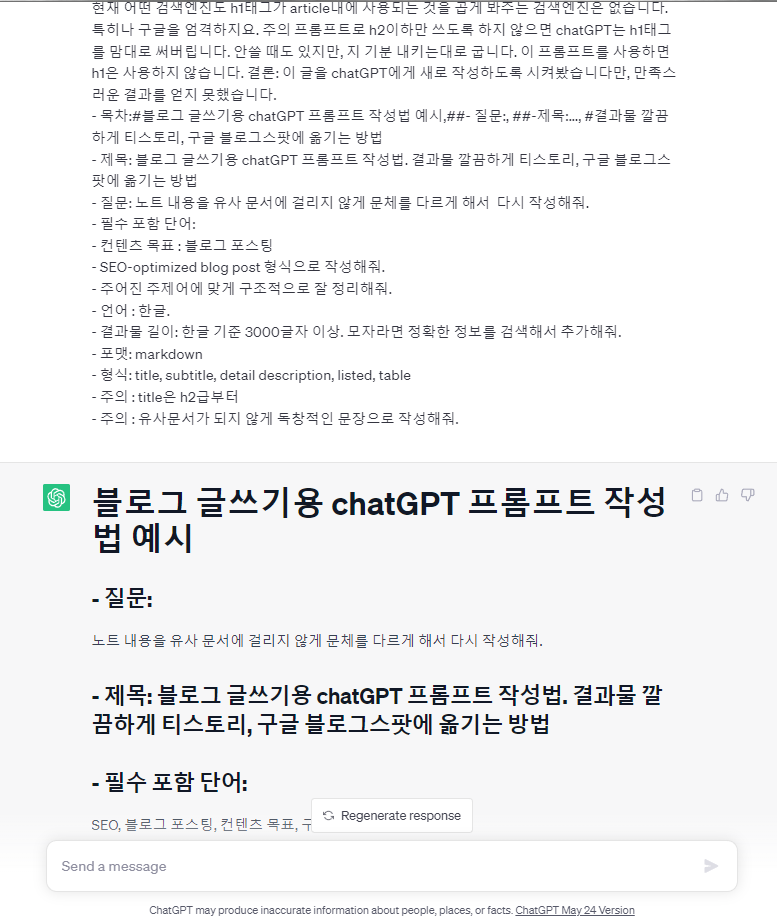 - 제목: 블로그 글쓰기용 chatGPT 프롬프트 작성법. 결과물 깔끔하게 티스토리, 구글 블로그스팟에 옮기는 방법