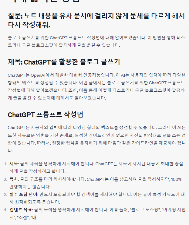 실질적으로 chatGPT에게 명령을 내리는 프롬프트입니다. 유사문서에 걸리지 않게 문체를 다르게 해서 다시 작성해 줘라고 명령해도, 아직까지는 chatGPT의 능력에 한계가 있습니다. 일단 집중력이 좋지 못합니다. 노트: 내용에 다양한 글을 수집해서 던져주면 처음에는 집중력을 가지고 의미는 같지만 전혀 다른 문장으로 작성하기 시작하지만, 조금만 지나면 노트의 내용을 그대로 가져다 쓰기 시작합니다. 그러니 웬만하면 인터넷에서 긁어온 글은 최소한으로 주는 것이 좋습니다.