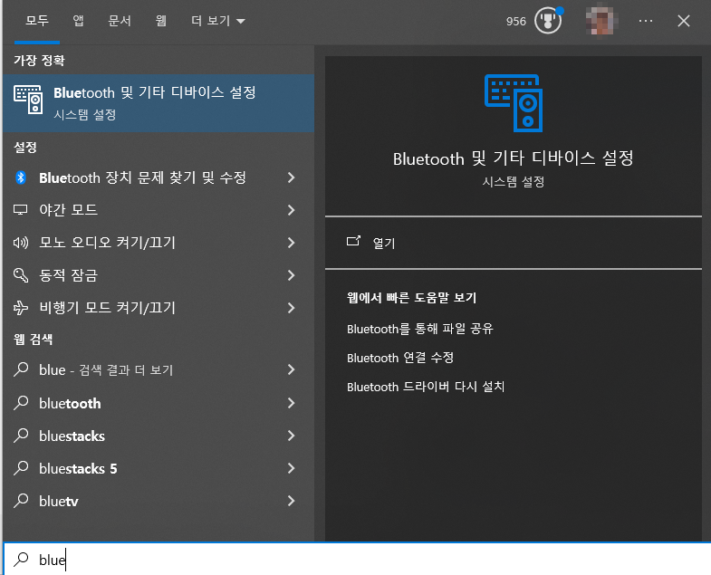 - 설정 열기: 윈도우 검색창에 'bluetooth'를 검색하고, '블루투스 및 기타 장치 설정'을 선택합니다.