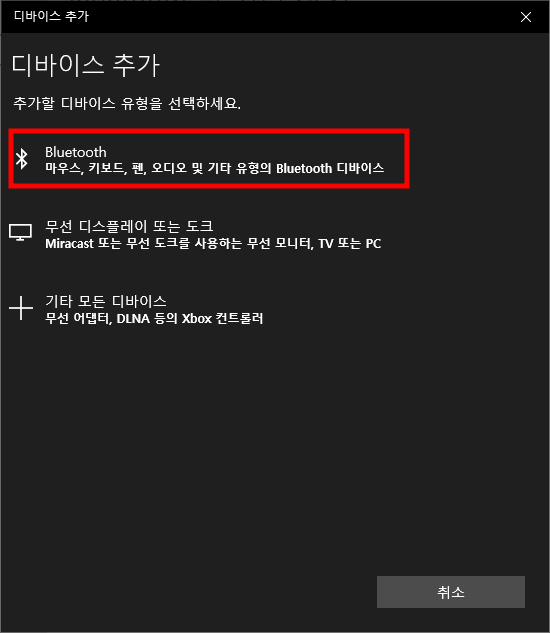 - 블루투스 선택: 나타나는 옵션 중에서 '블루투스'를 선택하여 블루투스 장치 검색 모드로 진입합니다.
