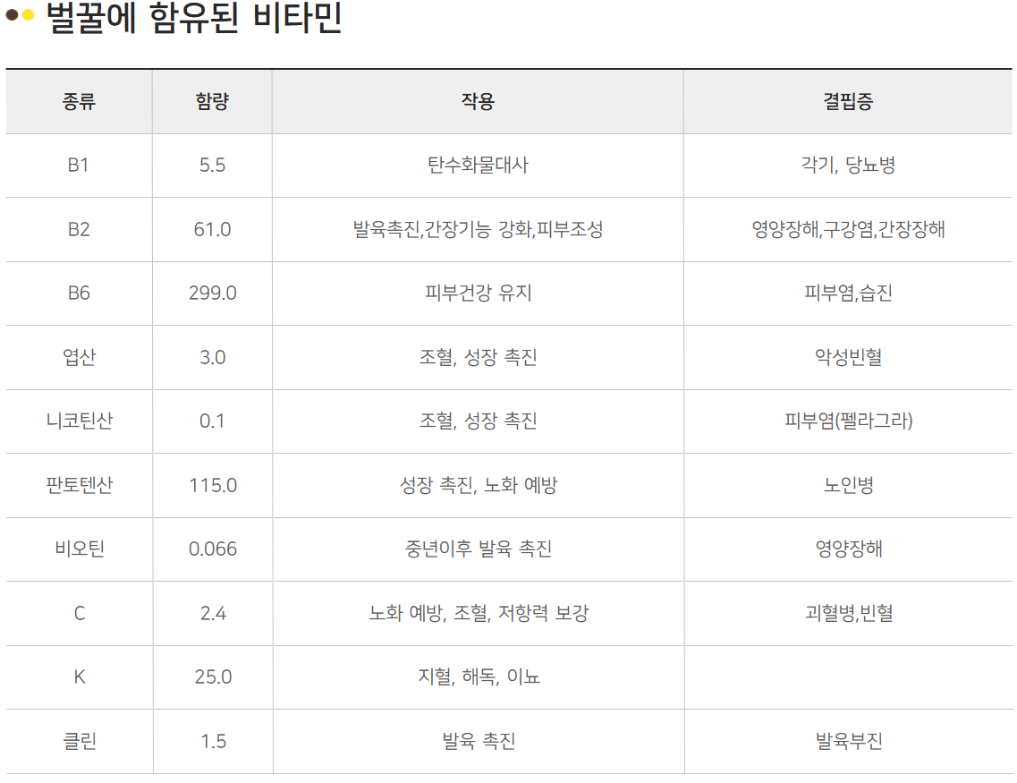 아미노산이 0.2%~0.5%, 비타민 0.05%, 미네랄 0.1% 정도 차지합니다. 양봉 생산품 판매업자들은 바로 이 구간을 확대해서 과대광고를 해댑니다. 아미노산과 비타민이 기껏해야 0.55% 정도 들어 있는데, 얘네들끼리만 함유량을 표기하면서 단위를 빼버립니다. 아주 악질이죠.