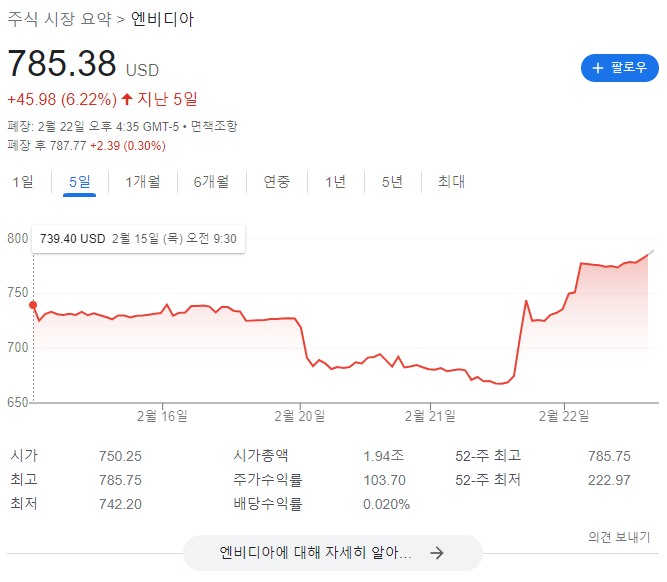 엔비디아(NVIDIA) 주가 : 저도 천원 주식으로 급락한 날 좀 구입했지요. 기름값 정도 벌었네요. ㅎ 몰빵할 껄 그랬나요? ㅋㅋㅋ