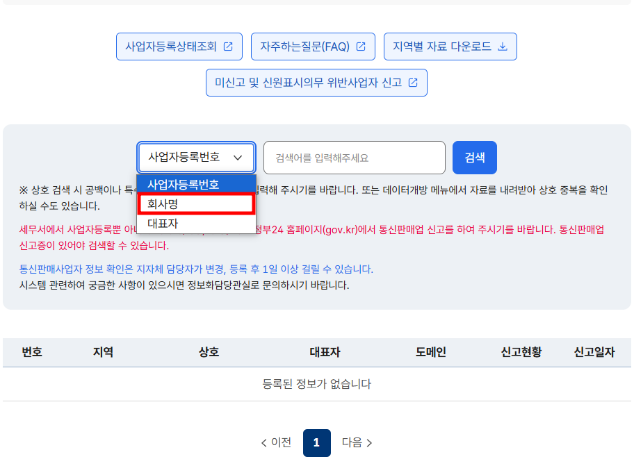 - 상호명, 대표자명, 지역 등 입력 후 검색