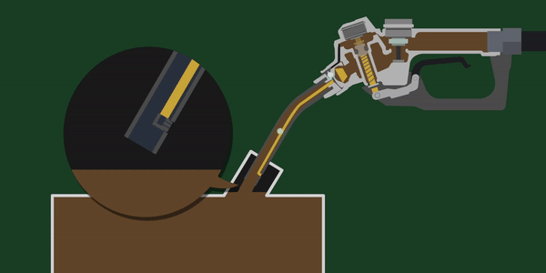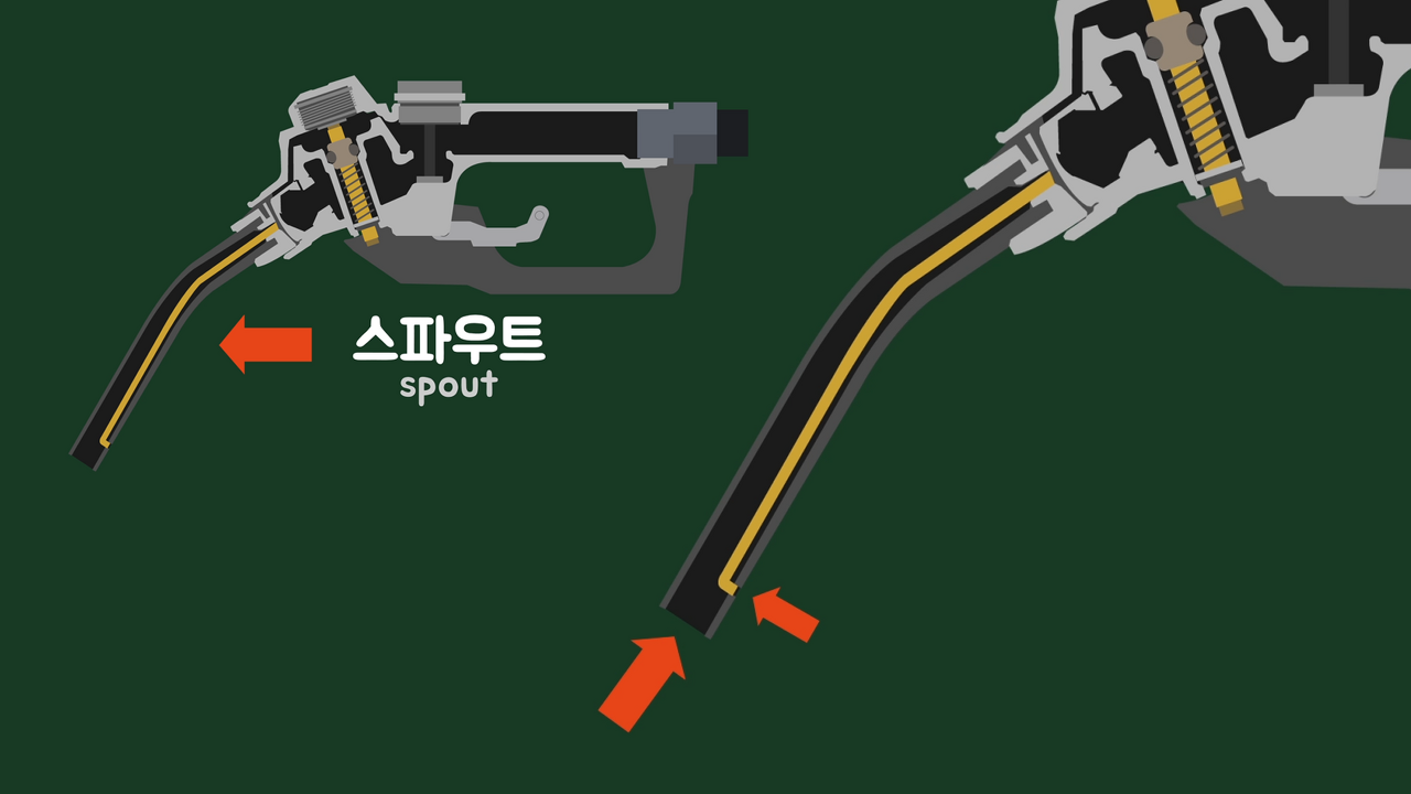주유를 시작하려면 주유건의 레버를 당겨야 합니다. 이때, 스파우트의 큰 구멍에서는 연료가 나오며, 반면 작은 구멍에서는 공기가 빨려 들어갑니다. 이렇게 빨려 들어간 공기는 주유건과 함께 자동차의 연료탱크로 이동하게 됩니다.