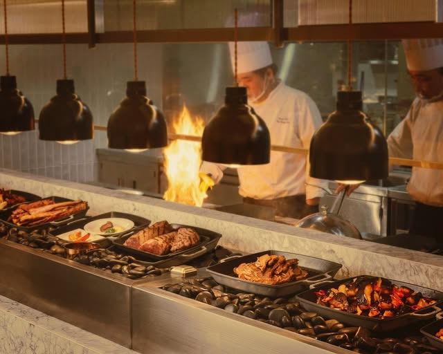 - 라이브 스테이션: 셰프가 직접 조리하는 스테이크, 양갈비, 한우 구이